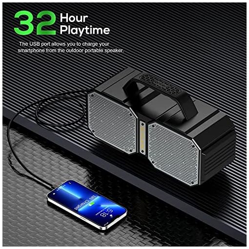 ♩♪♫【IPX6 Waterproof Speakes】As a Power Bank to Charge your Smart Device. you Can use this Speaker to Charge your Smartphone Via a usb Cable. there Is a Massive Built-In Battery, a Single Charge Gives you Enough Juice to 32 Hours of Playtime. Ipx6 Waterproof Mechanical Casings Makes It Suitable For Outdoor Take the Waterproof Rugged Bluetooth Speaker With you on Camping Trip or Beach Party.