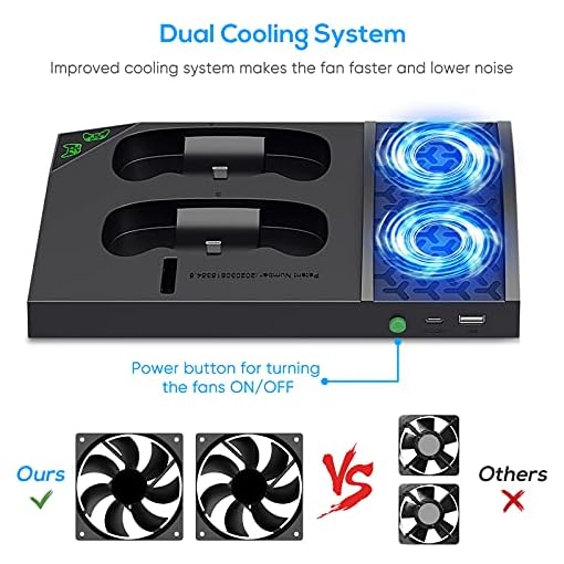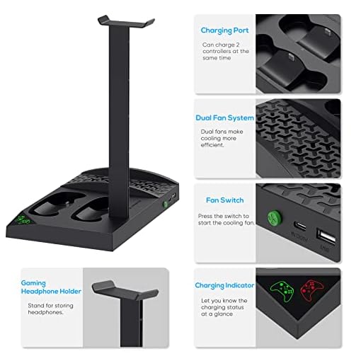 MENEEA Charger Stand with Cooling Fan for Xbox Series S Console and Controller,Vertical Dual Charging Dock Accessories with 2 x 1400mAh Rechargeable Battery and Cover, Earphone Bracket for XSS