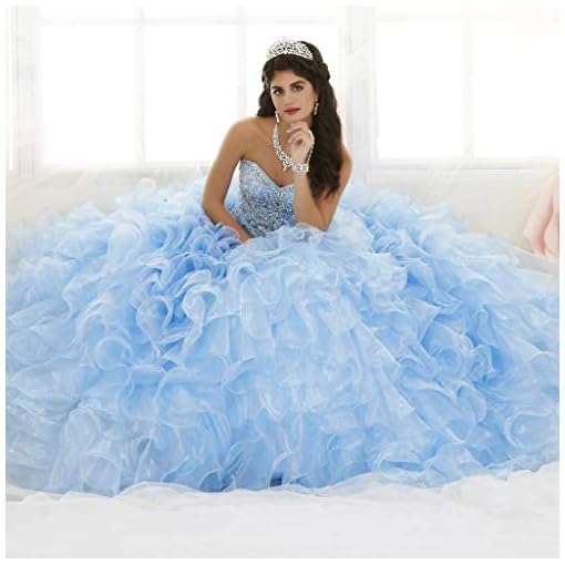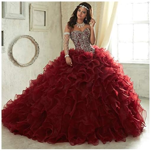Sweetheart Crystals Beaded Ball Gowns Quinceanera Gowns with Organza Ruffled Sweep Train for Women Girls.